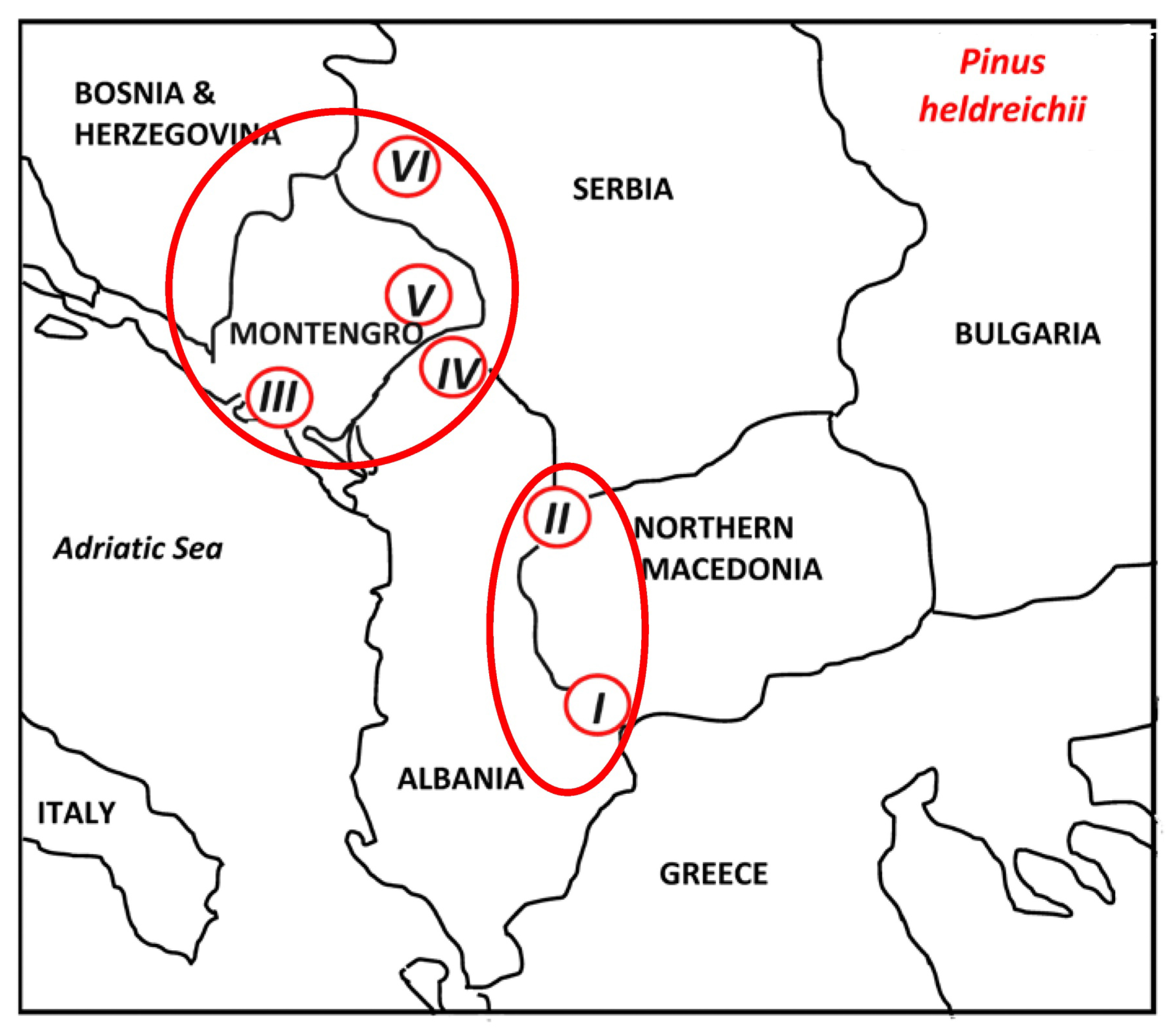 - Graphical illustration of Pinus heldreichii populations. Scardo-Pindic massif: Population I: Mt. Babe; Population II. Mt. Šara; Dinaric massif: Population III: Mt. Lovćen; Population IV: Mt. Zeletin; Population V: Mt. Bjelasica; Population VI: Mts. Zlatib
