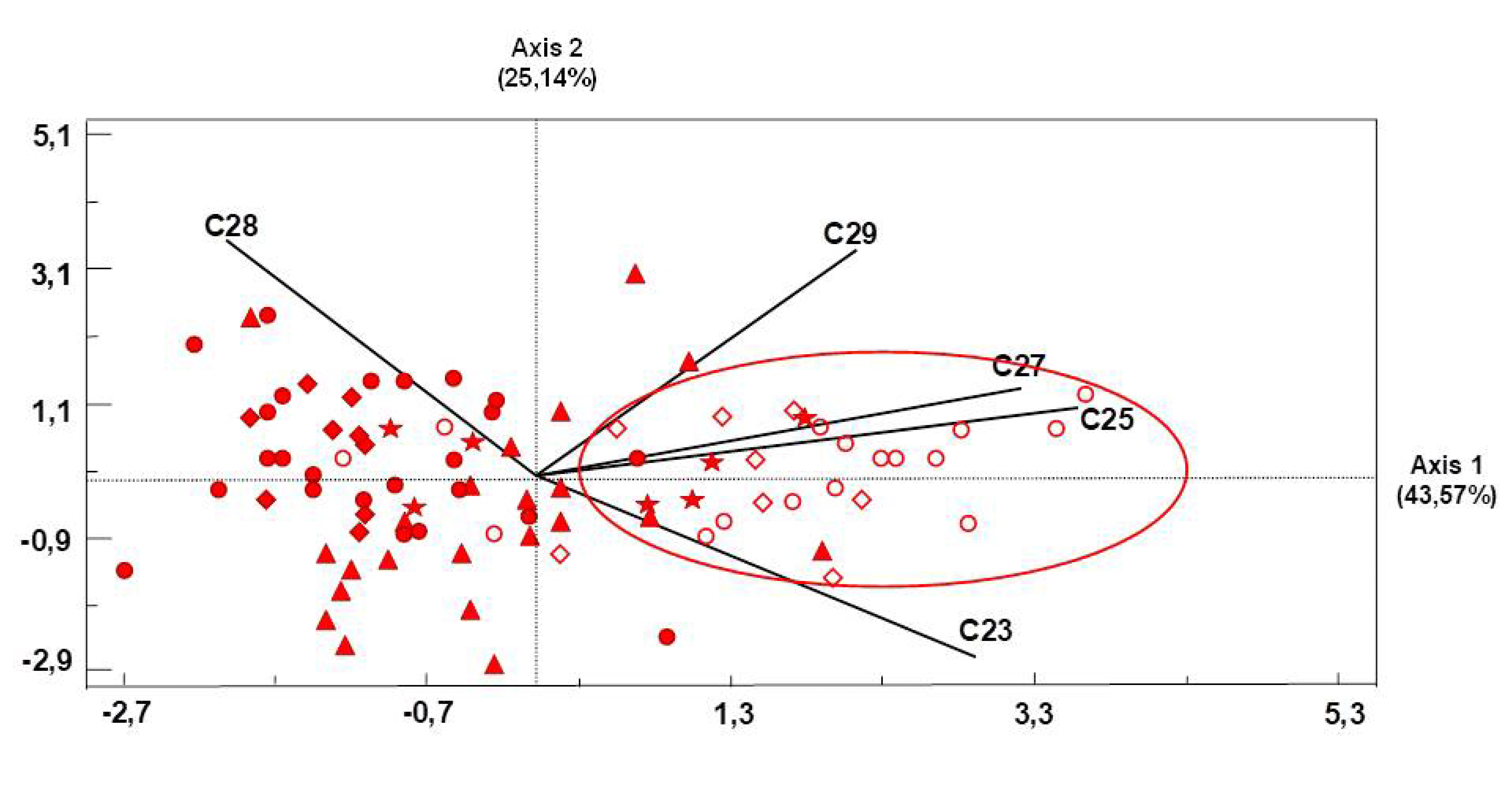 - Principle-component analysis of five selected n-alkanes isolated from 88 Bosnian pine-tree samples from six populations. n-Alkanes: C23, C25, C27, C28, and C29. Population I: Mt. Babe, ; Population II: Mt. Šara ; Population III: Mt. Lovćen