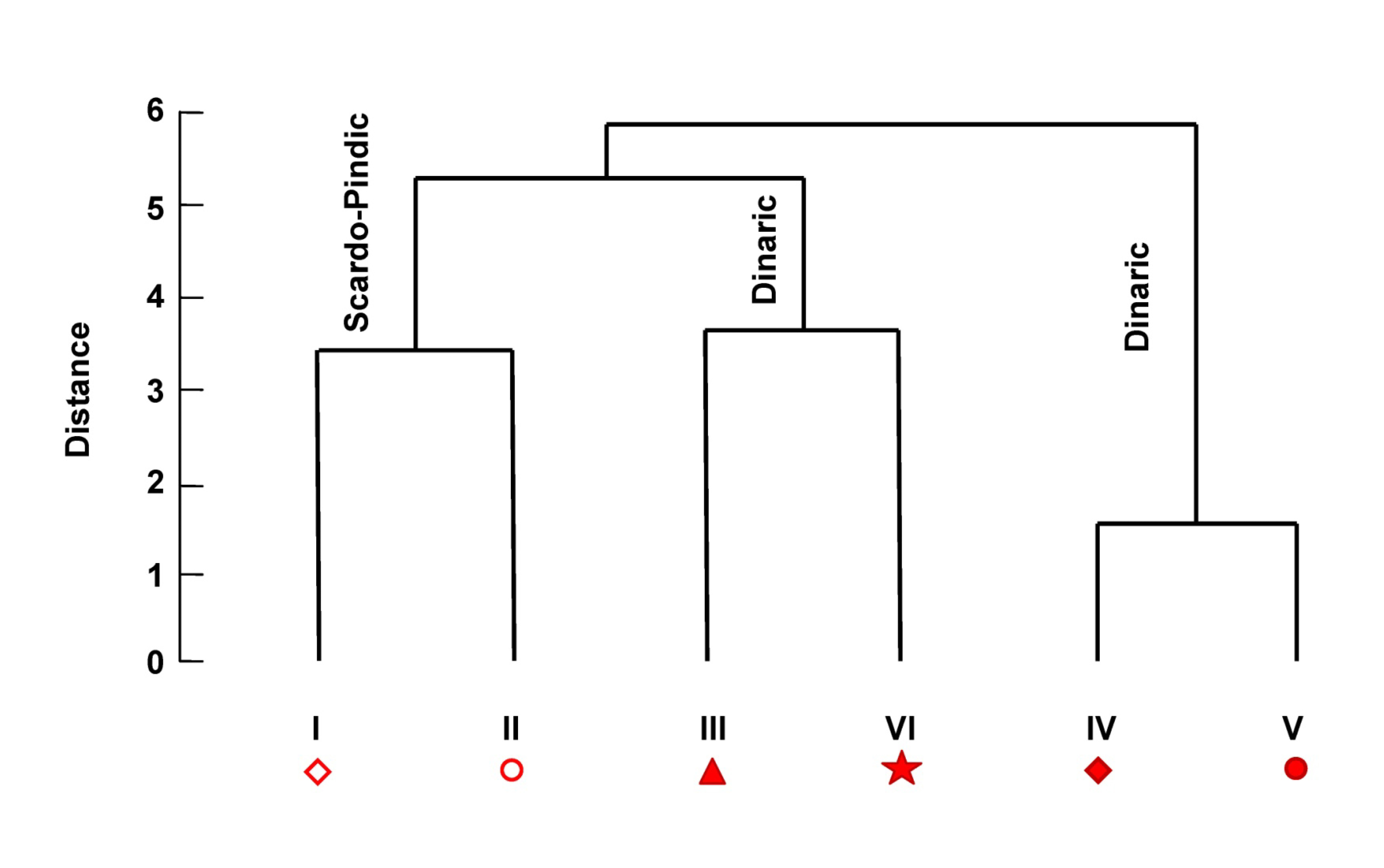 - Dendrogram based on a ‘nearest-neighbor method’ (square Euclidean distance) of the studied populations I–VI (mean values) of P. heldreichii. The numbers on the vertical axis refer to distance level, calculated on the basis of differences between populatio